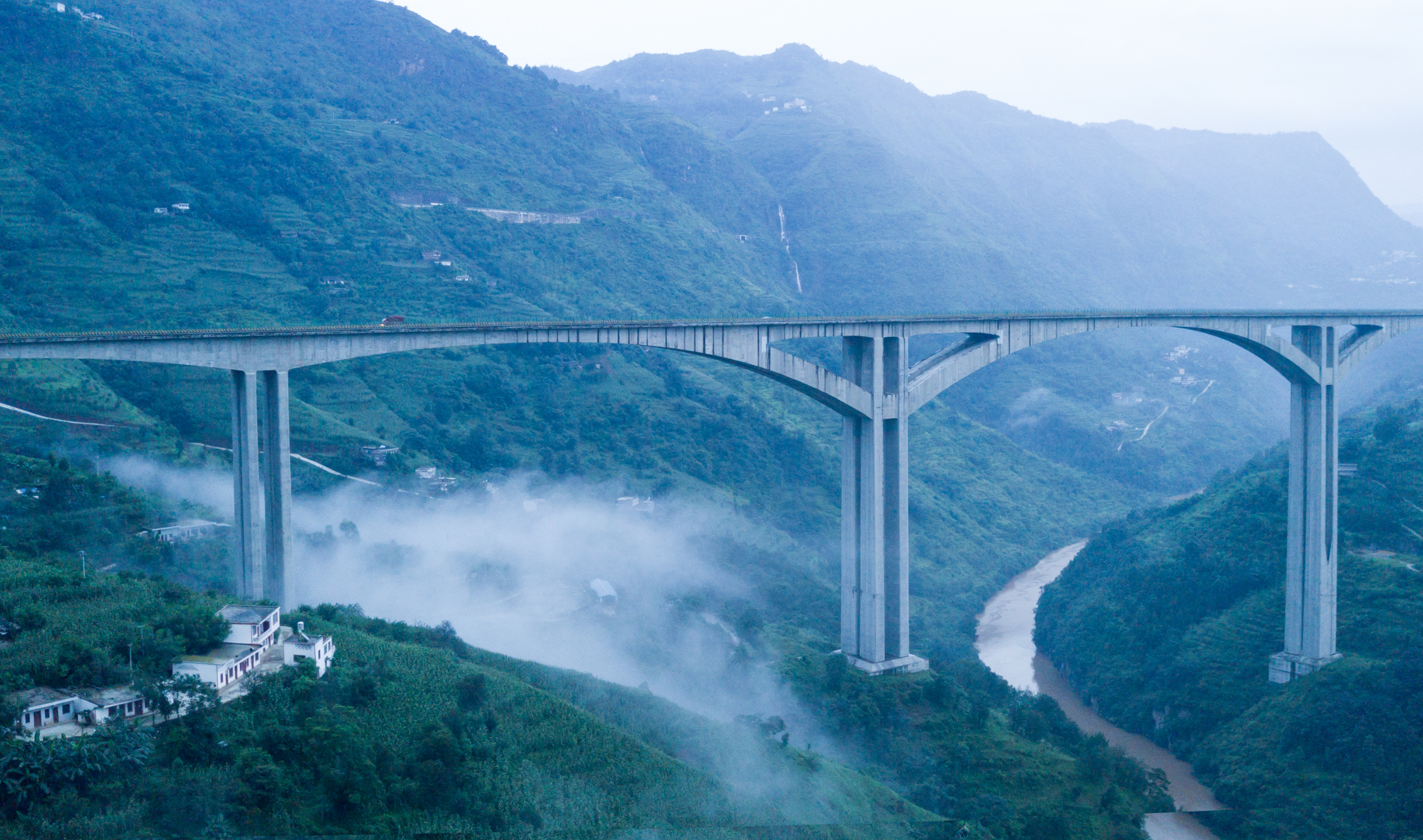水盤高速公路北盤江特大橋全長(zhǎng)1261m,主跨290m,是目前亞洲最大跨徑的預(yù)應(yīng)力混凝土連續(xù)(空腹式)斜腿剛構(gòu),被譽(yù)為“世界第一腿”。其空腹式結(jié)構(gòu)形式填補(bǔ)了跨徑在200~400m之間缺乏經(jīng)濟(jì)適用橋型的空白;研發(fā)了“下弦采用斜爬掛籃結(jié)合臨時(shí)扣掛系統(tǒng)懸澆,上弦采用支架結(jié)合移動(dòng)模架滯后下弦節(jié)段現(xiàn)澆”部級(jí)施工方法,并研制了大傾角、變曲率、可斜向行走的上置斜爬式掛籃國(guó)家發(fā)明專利。大橋于2013年8月16日建成通車。